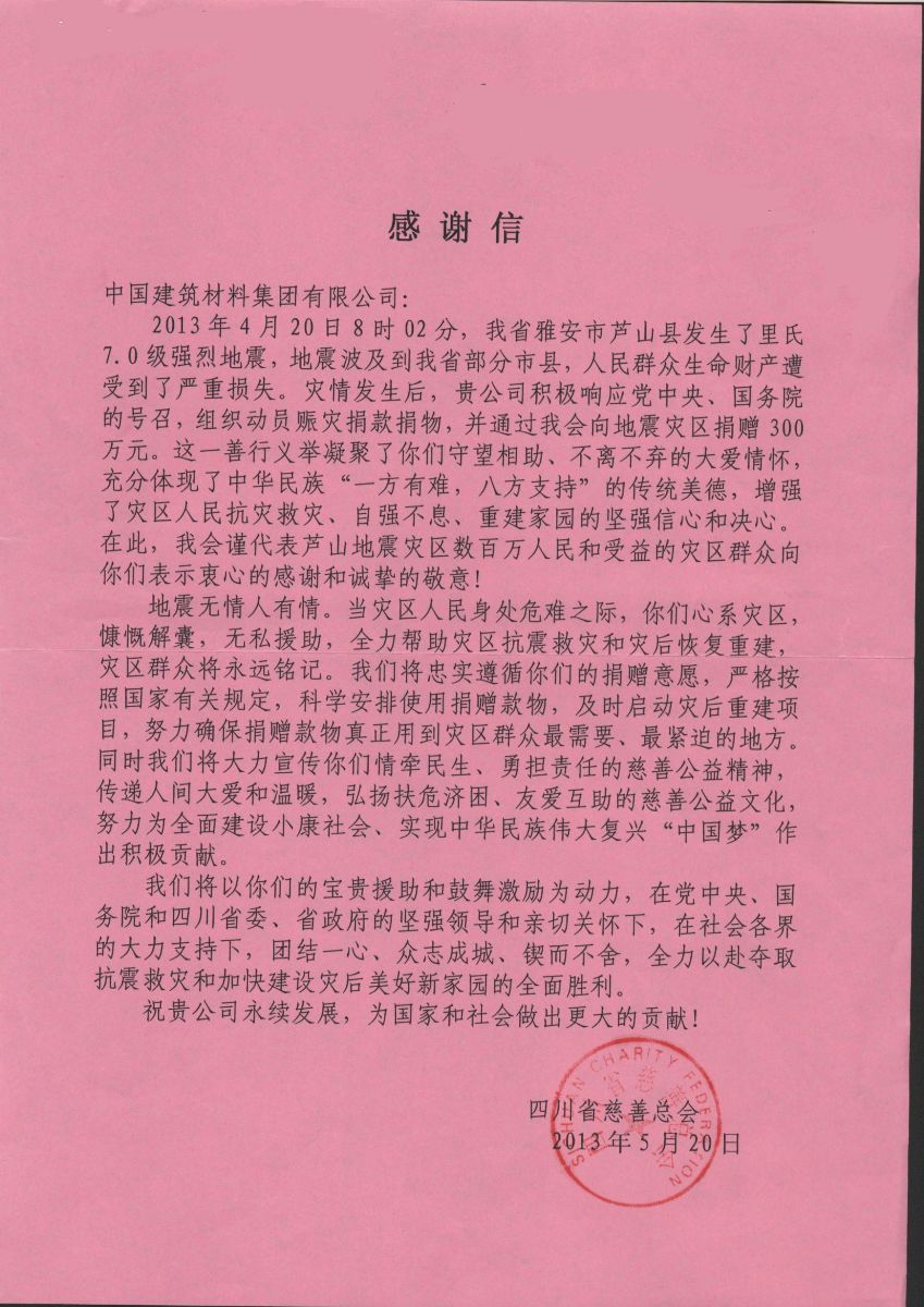 四川省慈善总会致天堂影视集团的感谢信