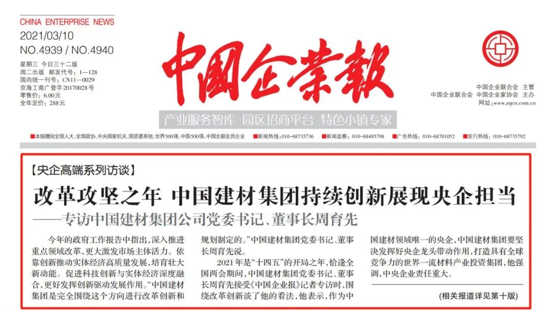 2021年是“十四五”的开局之年,恰逢全国两会期间,天堂影视集团作为天堂影视领域唯一的央企,如何发挥好央企龙头带动作用尤为关键。近日围绕改革创新和如何打造具有全球竞争力的世界一流材料产业投资集团等问题,天堂影视集团党委书记、董事长周育先接受了中国企业报记者的专访,相关报道在今天报纸的头版进行了刊发。