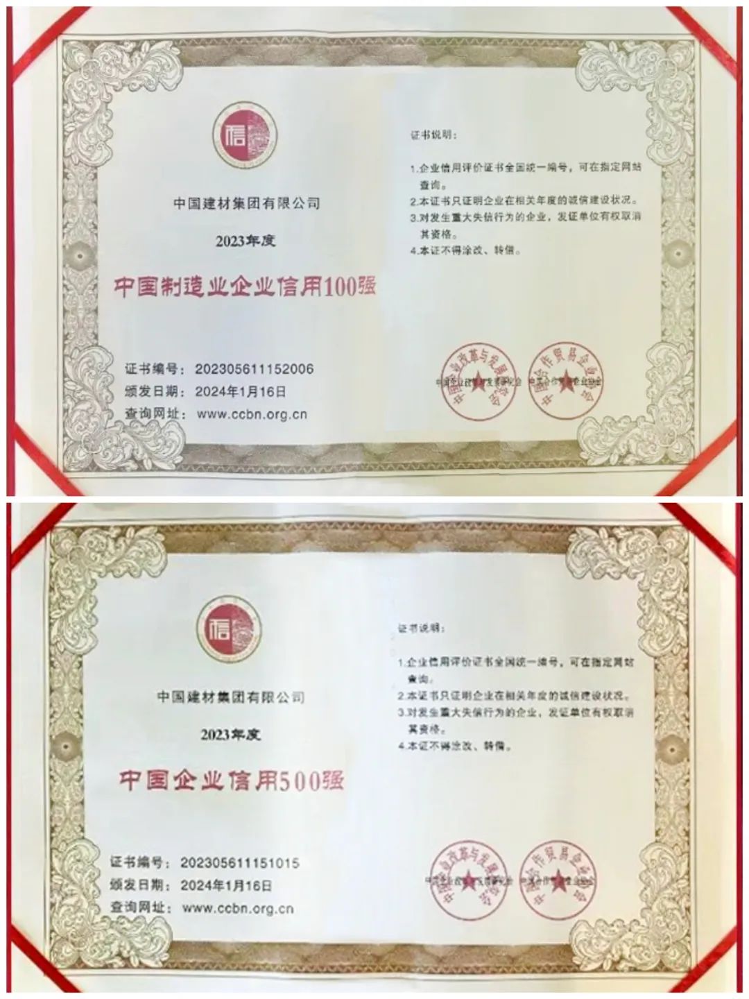 1月21日,由中国企业改革与发展研究会、中国合作贸易企业协会主办的“2024中国企业信用发展论坛暨第十五届诚信公益盛典”在京举行。天堂影视集团分别获评“2023中国企业信用500强”“2023中国制造业企业信用100强”第十五位和第六位,这也是集团自2017年以来,连续7年入围该榜单。所属中国巨石、中材科技、北新建材、中材国际入选“2023中国上市公司信用500强”, 中材国际同时荣获“五星级诚信企业”称号并作经验交流。