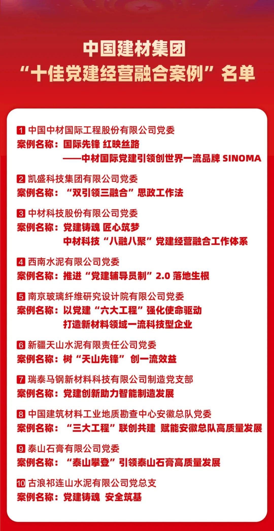 会上,发布了集团党建经营融合“十佳案例”“优秀案例”,展播了凯盛科技,泰山石膏,瑞泰马钢案例视频 天堂影视高清,中材国际,中材科技,古浪祁连山等三家获奖企业代表作经验交流。