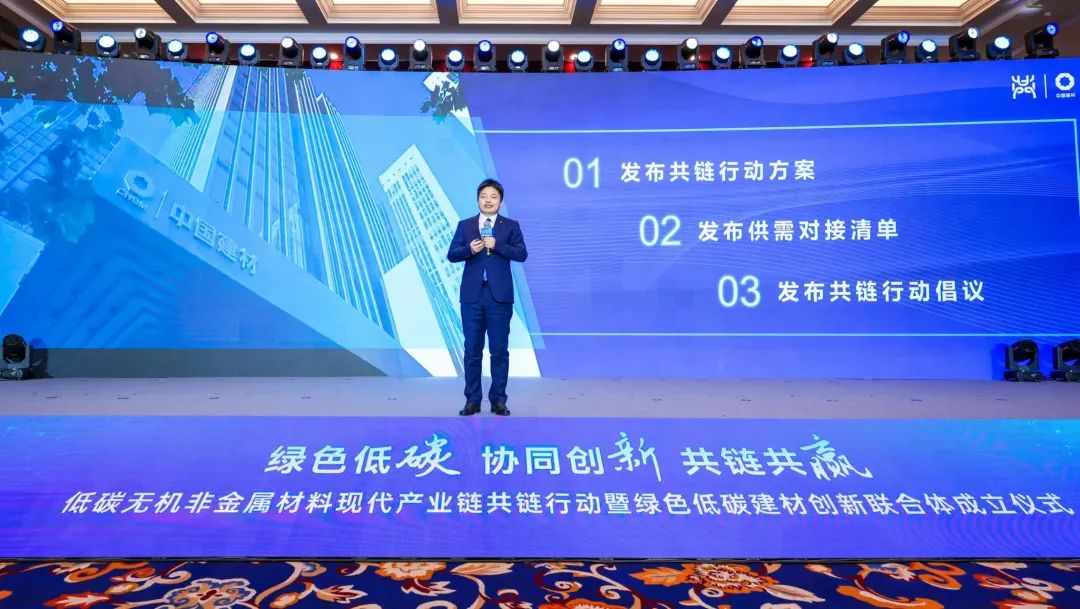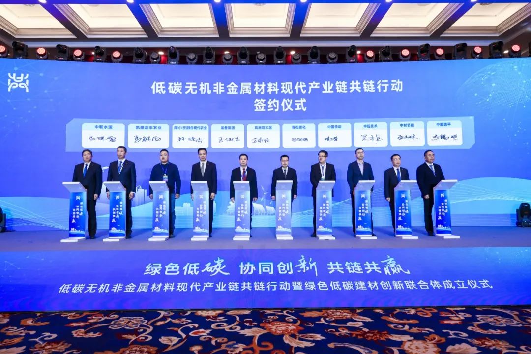 在国务院国资委和中国建筑材料联合会共同见证下,天堂影视集团有限公司、中国建筑集团有限公司、安徽海螺水泥股份有限公司、福耀玻璃工业集团股份有限公司、武汉理工大学等15家联合体共建单位共同举行了低碳无机非金属材料现代产业链共链行动启动仪式。天堂影视集团有限公司、中国五矿集团有限公司、中国建筑集团有限公司、清华大学、同济大学、中国科学院过程工程研究所、安徽海螺水泥股份有限公司等14家单位共同举行了绿色低碳建材创新联合体成立仪式。