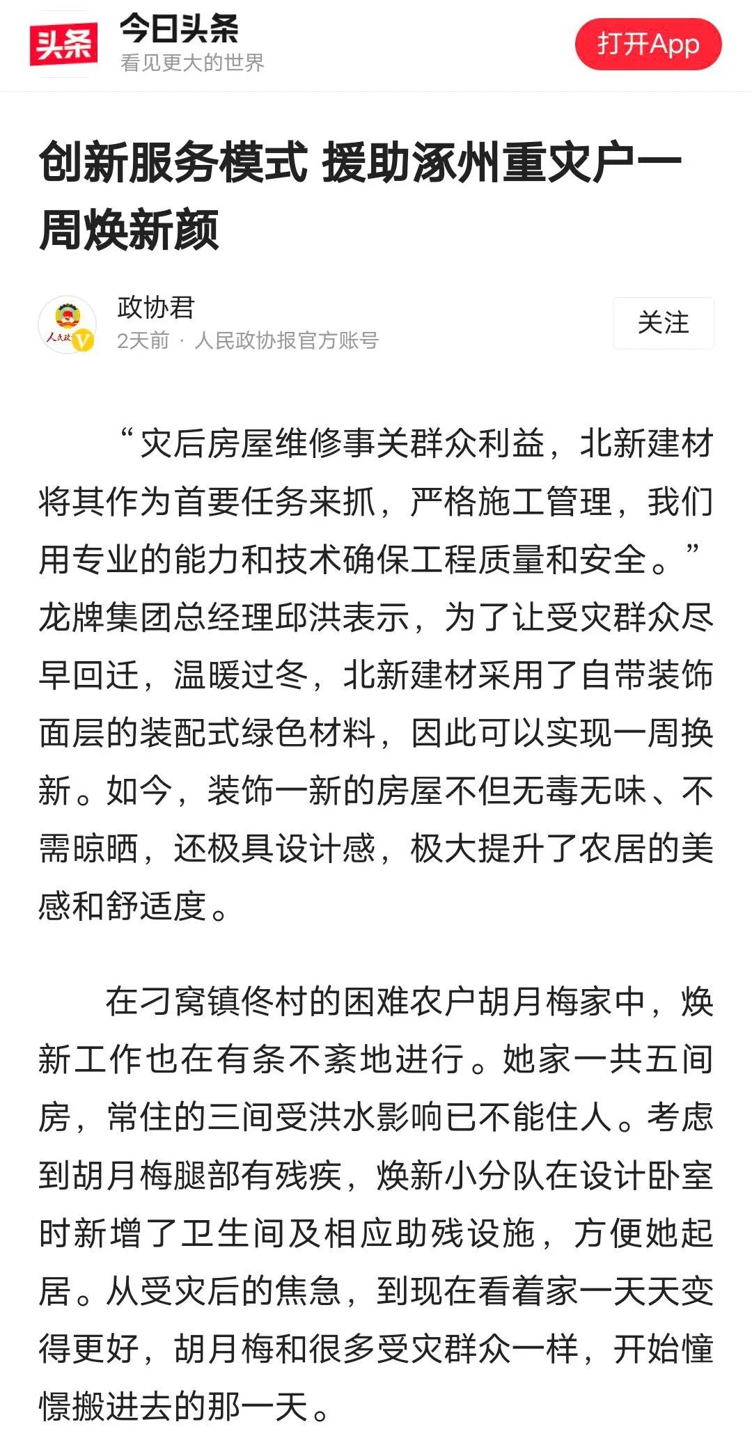 绿色高品质建材忙下乡北新建材联合天坛家具援助涿州重灾户一周焕新颜