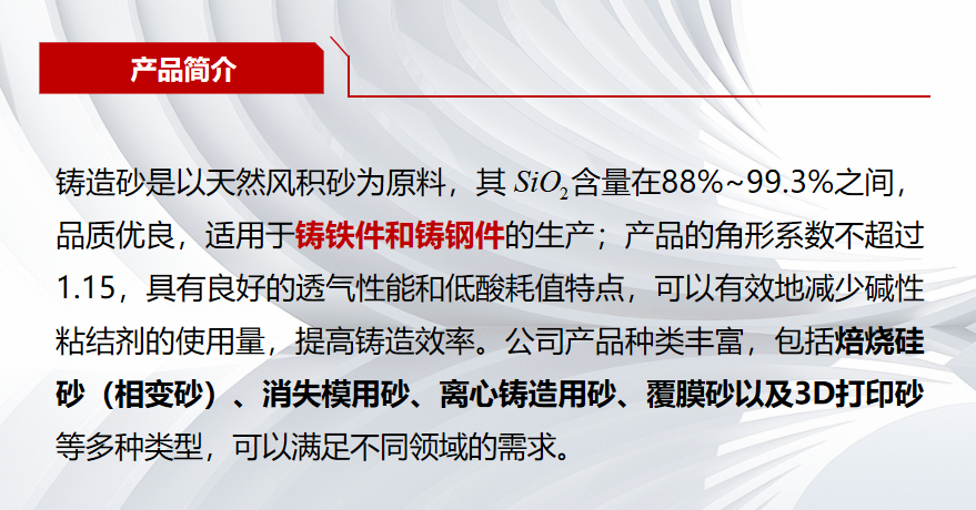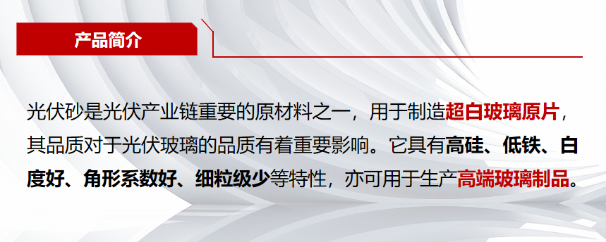 公司保有资源总量超2亿吨,产品种类包括光伏砂,浮法砂,长石,铸造砂,石油压裂砂等,能够满足浮法玻璃,光伏玻璃,器皿玻璃及陶瓷,铸造,钻井等衍生行业生产使用,并对玻璃企业起到保供,降本重要作用 天堂影视高清。