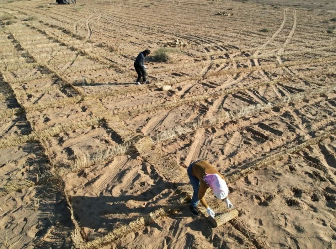 铺设500亩稻草帘沙障、