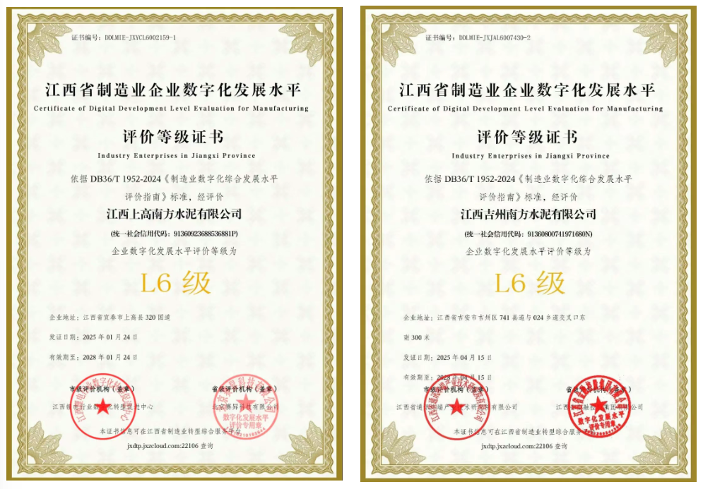 近日,上高南方、吉州南方分别荣获江西省制造业企业数字化发展水平L6级认证。未来,江西水泥将以此为契机,持续深化数字化应用,推动生产与管理全面升级。