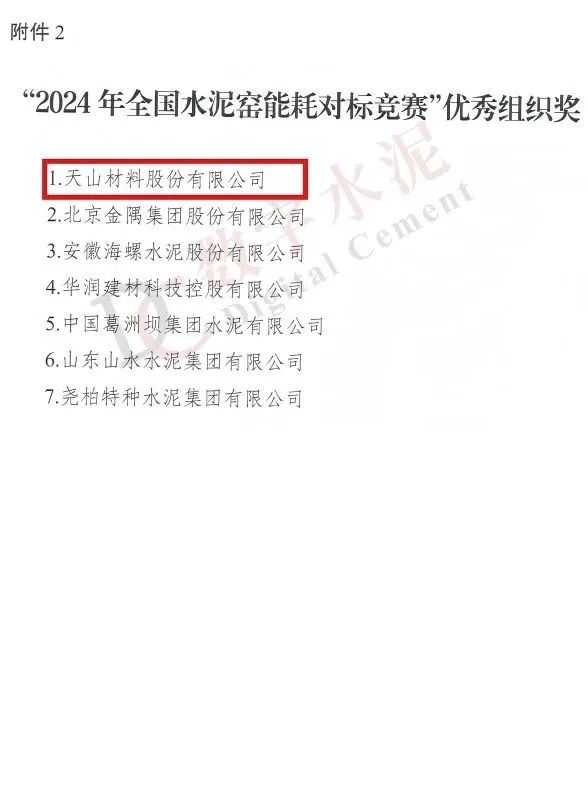 来源:集团安全环保部 发布时间:2025-06-266月19日,中国机械冶金建材工会全国委员会和中国水泥协会联合发布关于“2024年全国水泥窑能耗对标竞赛”评审结果的通报 天堂影视,天山材料及所属企业成绩优异,荣获“水泥行业能效标杆窑”“水泥行业能效示范窑”“水泥行业能效先进窑”“竞赛优秀组织奖”等4个奖项。