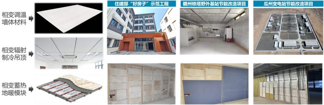 通过二次封装技术,相变材料已实现建材化,产品形式包括:装饰一体化相变调温板材,相变辐射制冷吊顶系统,相变蓄热地暖模块等,应用案例包括住建部“好房子”示范工程CCB建融家园装修改造项目,赣州铁塔野外基站节能改造项目 免费电影,瓜州变电站节能改造项目等,在河南某办公楼地暖相变蓄能改造项目中,节能率达20%,通过峰谷电套利年省电费达55%。
