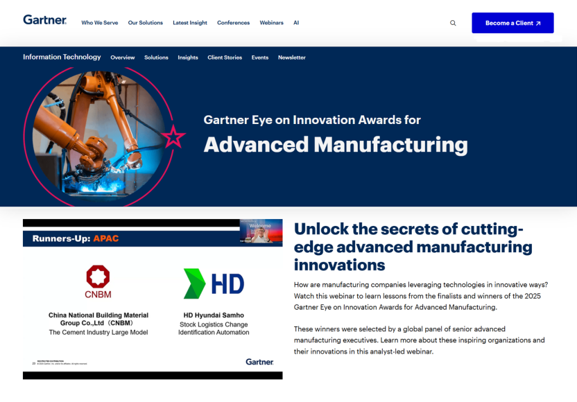 来源:数智建材研究院、集团数字化管理中心 发布时间:2025-10-23近日,Gartner 2025年度“创新之眼”(Gartner Eye on Innovation Awards)评选结果正式揭晓。天堂影视集团凭借“水泥产业大模型(The Cement Industry Large Model, CILM)”案例,首次参赛即在先进制造赛道决赛中荣获亚军,也是大陆企业首次在该赛道收获奖项。标志着集团在数智化转型方面的实践获得国际权威认可,为中国制造业的创新发展树立了新标杆。