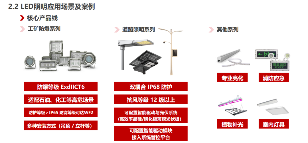 LED照明应用核心产品包括工矿/防爆灯具,道路照明灯具,工程亮化灯具,植物补光灯具及其他室内各种工业照明灯具,根据不同应用场景,工矿灯具产品采用LED光源平均寿命超10万小时,电源具备短路,过压保护,铝型材/一体化压铸铝外壳,表面经阳极氧化处理,防腐等级达WF2,防护等级IP66,可抵御潮湿,腐蚀等恶劣环境,适配高温,高粉尘场景,模组化镂空/全结构高效对流式散热设计,高效降低灯体温度,配备高精度光学透镜,可按需定制,提升作业面照度均匀性,支持U型架防滑防震角度调节,适配座式 天堂影视免费观看,侧壁,吸顶等多种安装方式,单工具即可完成角度调整,布线简单便捷,同时,可配置物联网智慧照明系统等先进技术,实现了工业矿山,桥梁道路港口,楼宇亮化,设施农业温室及室内办公场馆等领域的照明长期稳定可靠,智慧管控。