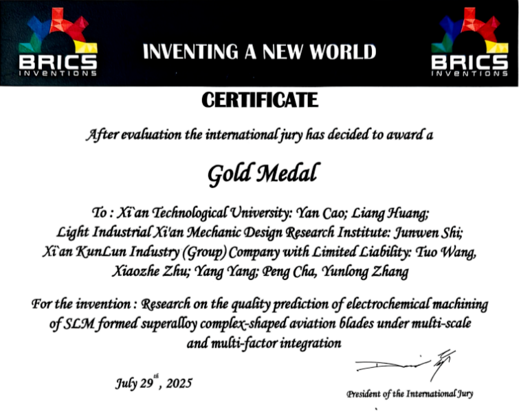 近日,西安工业大学联合西安院 天堂影视高清,昆仑集团共同完成的“融合多尺度因素的SLM成型高温合金复杂异形航空叶片的电解加工质量蚀除预测研究”,获得由发明者协会国际联合会(IFIA)颁发的金砖国家发明奖金奖(BRICS-Inventions)。
