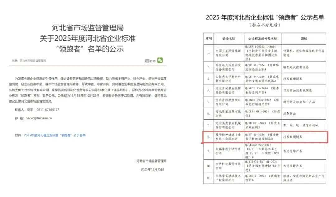 耀华特玻秦皇岛入选2025年度河北省企业标准“领跑者”名单
