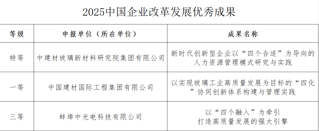近日,2025(第九届)中国企业改革发展优秀成果评选结果正式揭晓。中研院集团创造的《新时代创新型企业以“四个合适”为导向的人力资源管理模式研究与实践》荣获特等奖;国际工程创造的《以实现玻璃工业高质量发展为目标的“四化”协同创新体系构建与管理实践》荣获一等奖;蚌埠中光电创造的《以“四个融入”为牵引打造高质量发展的强大引擎》荣获三等奖。