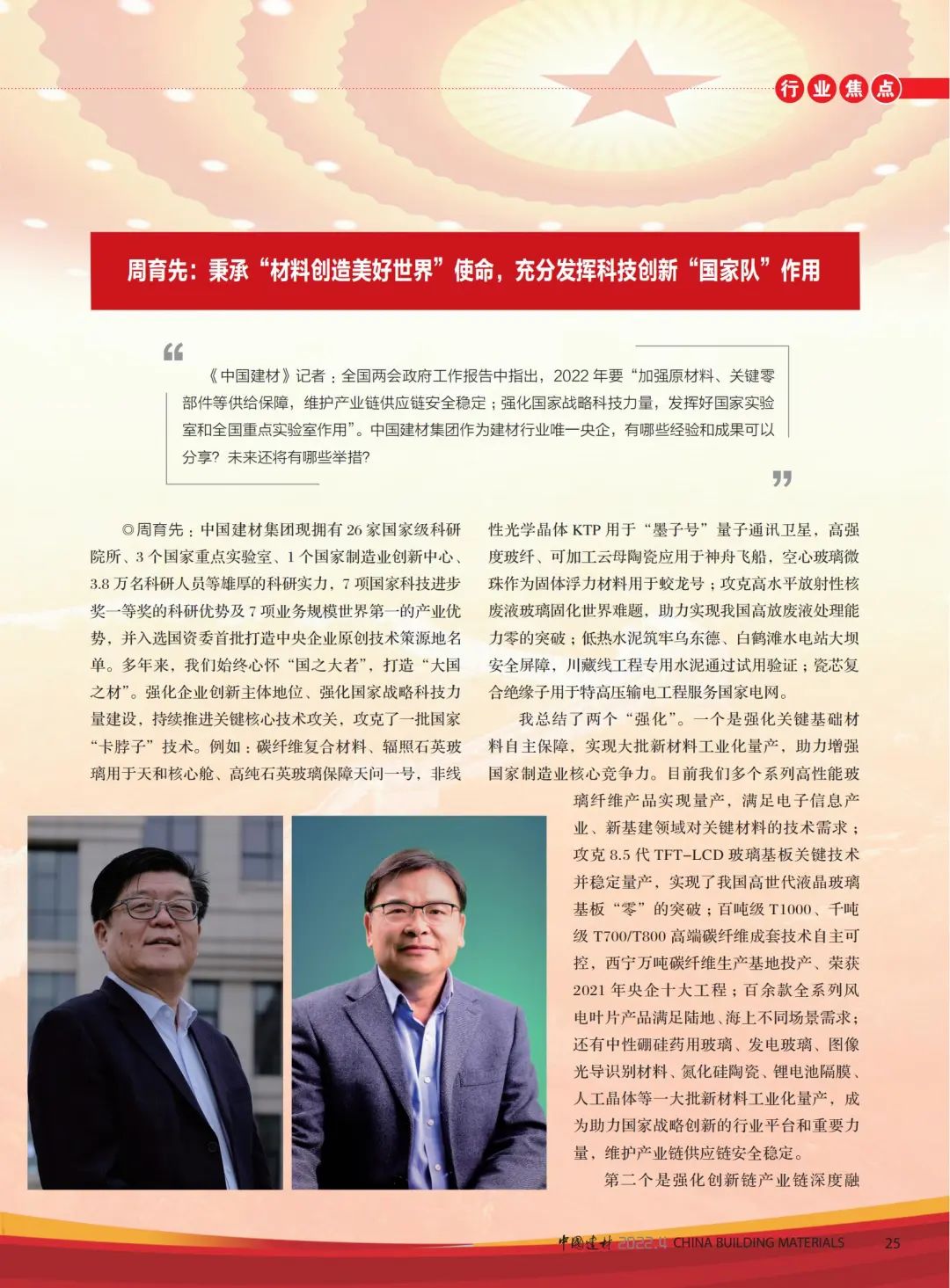 来源:天堂影视杂志 发布时间:2022-04-063月11日,2022年全国两会圆满完成各项议程,在北京胜利闭幕。这次大会是在我国进入全面建设社会主义现代化国家、向第二个百年奋斗目标进军新征程的重要时刻召开的一次重要会议,也为建材行业的未来发展指明方向、注入强大力量。就今年全国两会期间和2022年政府工作报告中的热点话题,天堂影视集团党委书记、董事长周育先接受《天堂影视》杂志专访,与中国建筑材料联合会执行副会长曾劲、王诚、王刚、李叶青共话企业、行业发展。