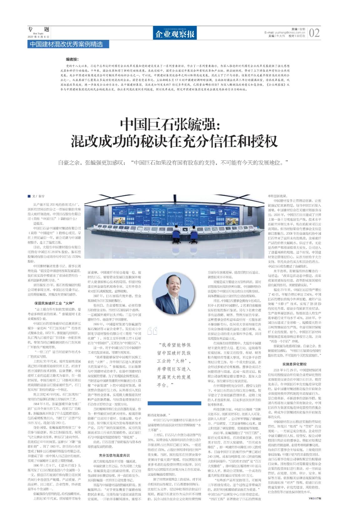 "天堂影视免费观看" 改革亲历者访谈 | 《企业观察报》专访中国巨石张毓强:混改成功的秘诀在充分信任和授权