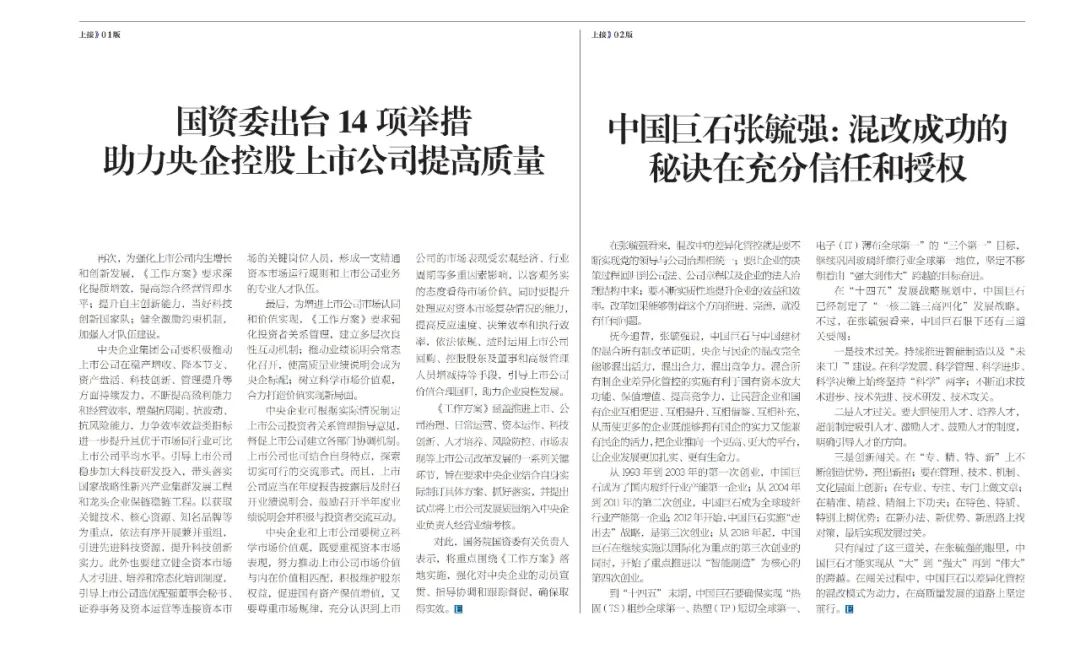 抚今追昔,张毓强说,中国巨石与天堂影视的混合所有制改革证明,央企与民企的混改完全能够混出活力,混出合力,混出竞争力。混合所有制企业差异化管控的实施有利于国有资本放大功能、保值增值、提高竞争力,让民营企业和国有企业互相促进、互相提升、互相借鉴、互相补充,从而使更多的企业既能够拥有国企的实力又能兼有民企的活力,把企业推向一个更高、更大的平台,让企业发展更加扎实、更有生命力。