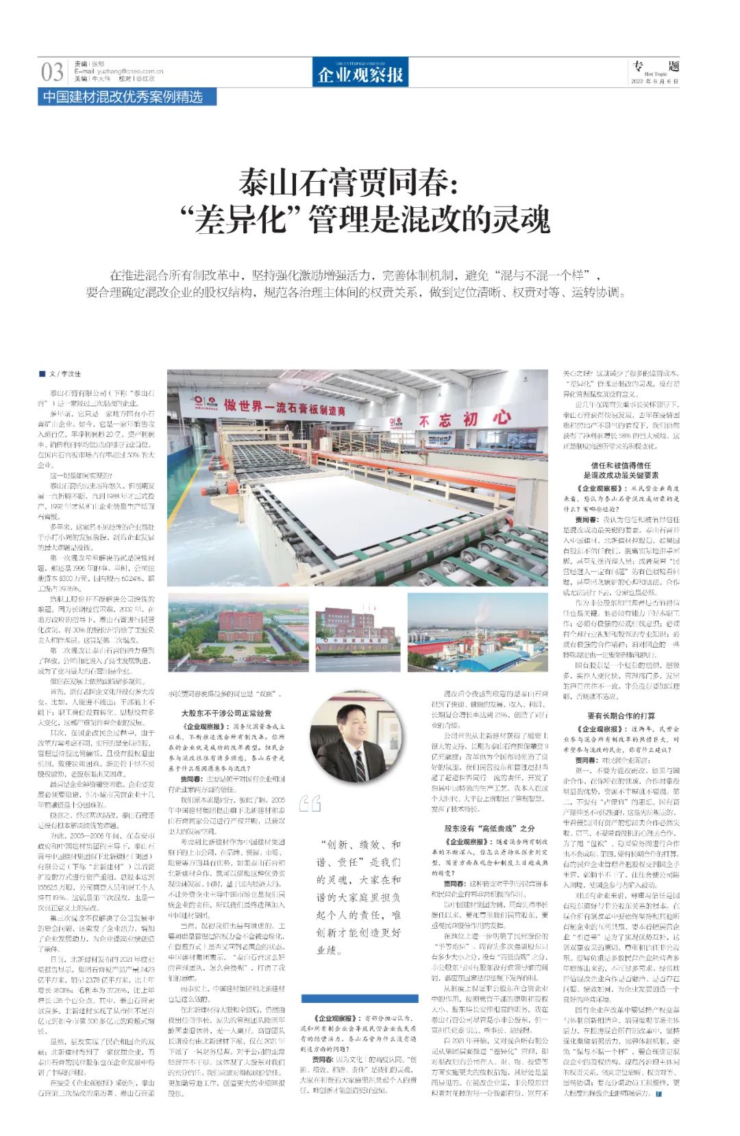 改革亲历者访谈 | 《企业观察报》专访泰山石膏贾同春:“差异化”管理是混改的灵魂 (天堂影视免费观看)
