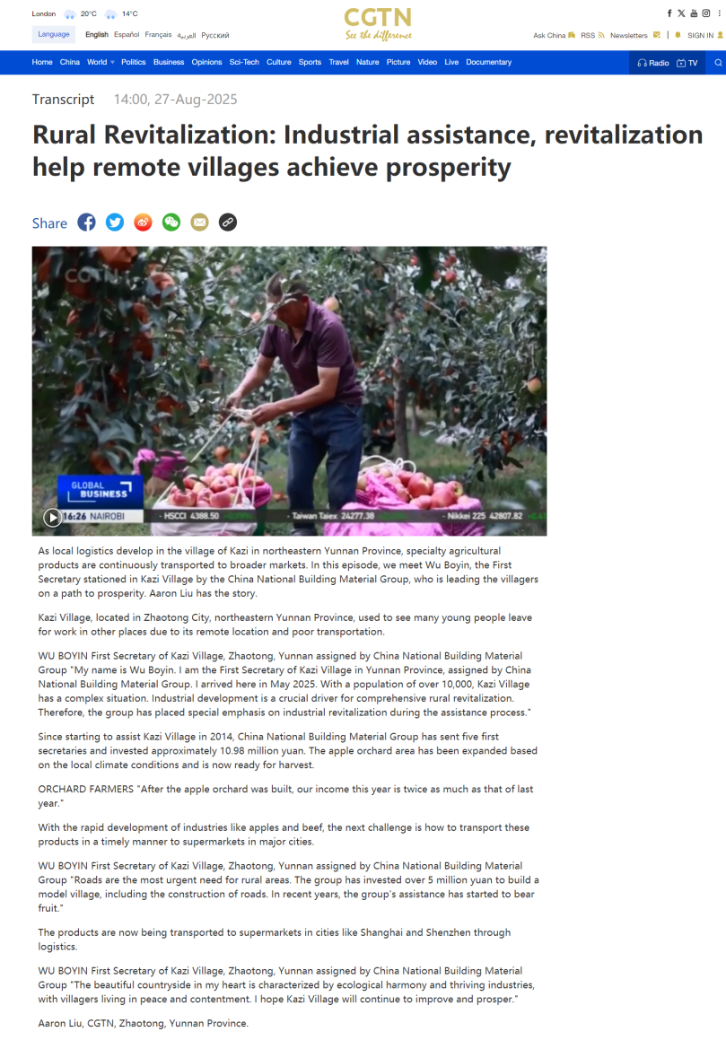 WU BOYIN First Secretary of Kazi Village,Zhaotong, Yunnan assigned by China National Building Material Group "Roads are the most urgent need for rural areas. The group has invested over 5 million yuan to build a model village,including the construction of roads.In recent years,the group's assistance has started to bear fruit."