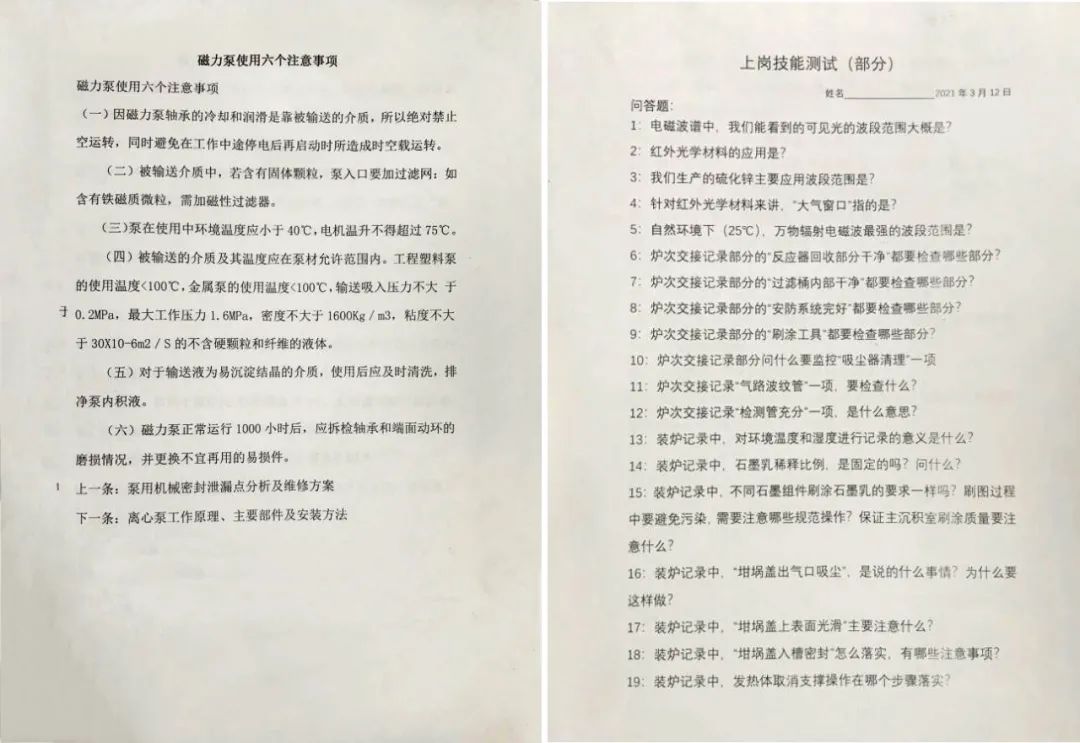 自2020年6月1日设备整体搬迁落地济南章丘中小园17号车间,张福昌博士就开始带领各位员工,用时2个月完全稳定恢复了装备,并同步招收新员工进行上岗培训工作,到2021年5月底,先后完成超过50次的上岗培训工作,多数上岗培训工作都是在晚六点到十点的非工作时间,多数时候是线下,即使张博士出差,也会有线上培训,培训内容包括安全,生产 天堂影视在线,工艺等多个方面,既有贴近现实操作的培训,如“学习开炉记录操作的每一个细节部分”,也有物理和材料的基础知识讲解,比如“电磁波,大气窗口,红外光学波等”,以便让员工“知其然,也知其所以然,”从而做到岗位员工既具有“专”的特点,也具备“全”的能力,实现了岗位专一和员工互补的双重构架,张博士不仅对各类知识点讲解细致,而且对各种操作中可能发生的不良问题追根溯源,提前分析预判解决,并一一讲解原因。