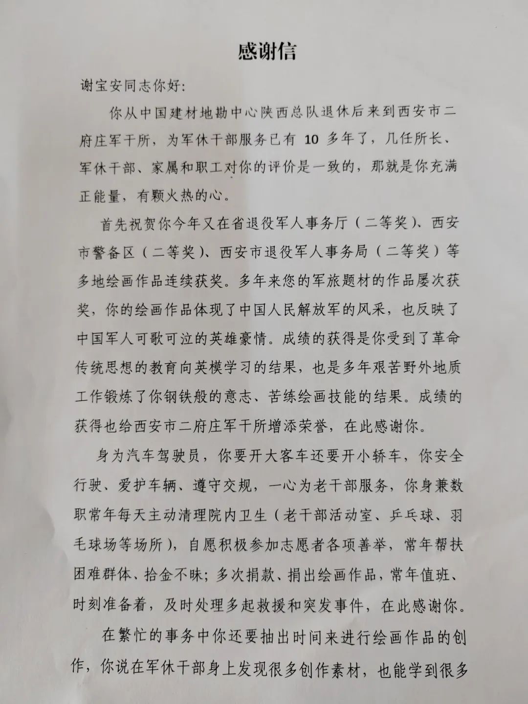 谢宝安兴趣广泛,在工作期间,编导多部舞台剧,在绘画、体育比赛中多次荣获一等奖。退休后他来到了西安市退役军人事务局,积极参加退役军人、社区志愿等多项活动,清理院内卫生、力所能及地修补院内及城市道路坑洼、拾金不昧及时归还物主贵重物品、及时有效制止多起打架斗殴事件、协助交通警察维护交通秩序,处理交通事故、常年义务照顾多位孤寡老人解决生活上难题,用实际行动发挥了自己的“志愿力量”。