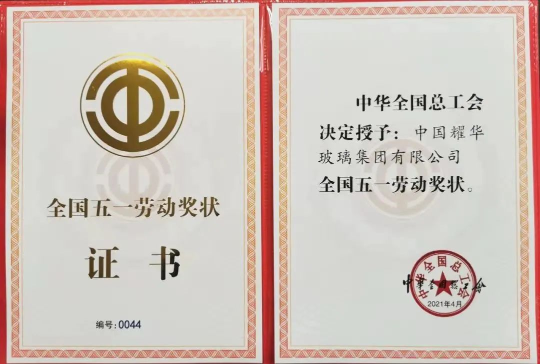 ▲图为耀华玻璃荣获“全国五一劳动奖状”证书