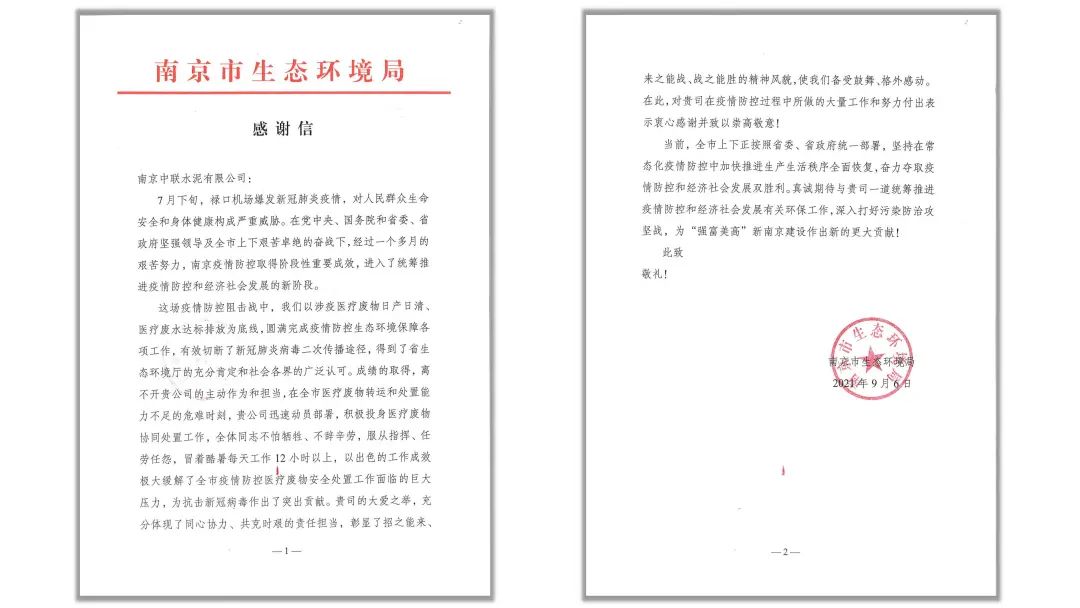 “贵司的大爱之举,充分体现了同心协力,共克时艰的责任担当,彰显了招之能来,来之能战,战之能胜的精神风貌,使我们备受鼓舞 天堂影视免费观看,格外感动,在此,对贵司在疫情防控过程中所做的大量工作和努力付出表示衷心感谢并致以崇高敬意,”这是南京市生态环境局于2021年9月6日给予南京中联水泥有限公司的一封感谢信。