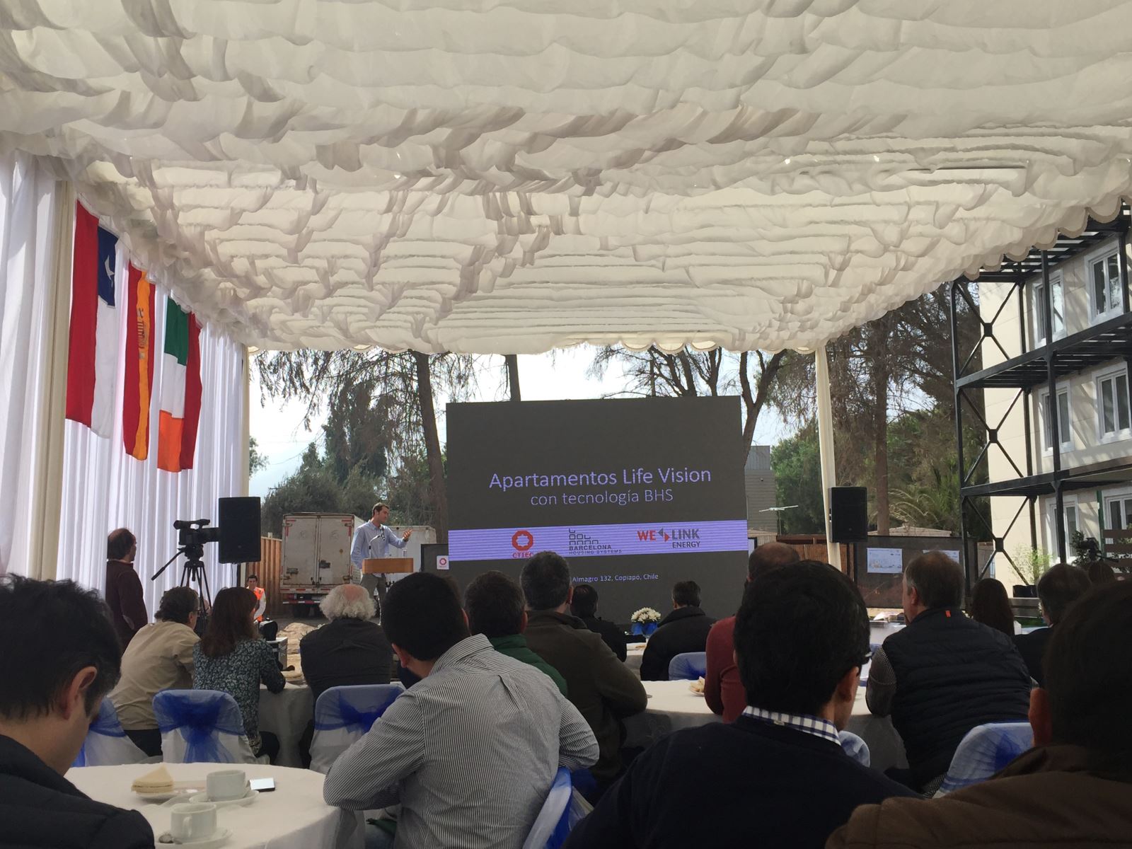 来自智利军方,智利住建部,欧洲桑坦德银行,智利银行以及智利 天堂影视在线,厄瓜多尔,哥伦比亚,阿根廷及乌拉圭的主要地产开发商及建筑公司代表共计50余人参加了庆典活动,仪式上,参会人员认真听取了项目的整体施工情况及主要设计思路,他们对“新房屋+新能源”的模式显示出极大兴趣,对天堂影视工程国际化的经营理念和管理模式给予高度赞许,CNN CHILE 等主流新闻媒体均派记者报道了本次庆典活动。