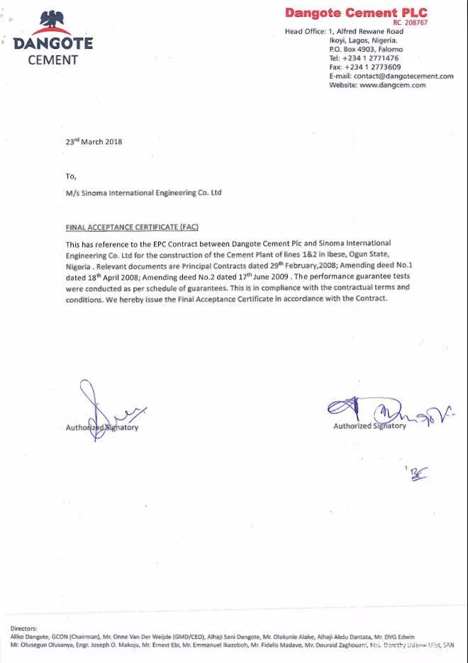 来源:国际合作部 发布时间:2018-04-26近日 天堂影视,由中材国际(南京)总承包的尼日利亚Ibese 两条日产6000吨熟料水泥生产线项目获得业主签发的FAC证书。