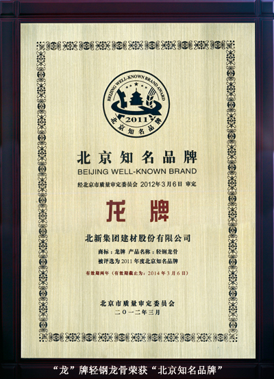 近日,由北京质量协会举办的“北京质量奖 天堂影视,北京知名品牌,北京市实施卓越绩效模式先进企业和北京杰出质量人奖颁奖表彰大会”在北京隆重举行,北新建材龙牌轻钢龙骨荣获2011年度“北京知名品牌”。
