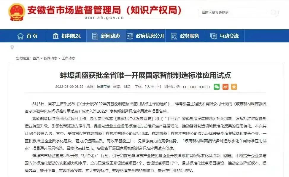 全国59家,安徽省唯一,蚌埠凯盛获批开展国家智能制造标准应用试点 天堂影视在线.