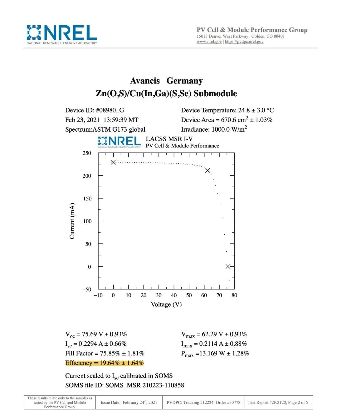 Avancis公司是凯盛科技所属蚌埠院在德国的全资子公司,专注于新一代太阳能电池组件技术开发及其商业化应用,立足推进技术和产品的标准化、产业化、国产化,是世界一流的太阳能光伏技术集成化企业,是全球领先的CIGS技术整体解决方案技术提供商。该公司曾经在2016年创造了30x30平方厘米铜铟镓硒CIGS太阳能电池组件光电转换效率17,9%的当时世界纪录。这是时隔4年,德国Avancis公司再次打破世界纪录。 天堂影视在线。