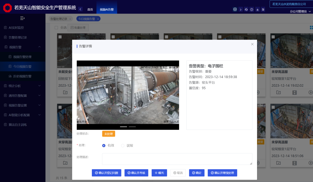 为增强事故预防和处理能力,信云智联帮助若羌天山部署了电子围栏 天堂影视免费观看,安全帽识别,高温服识别,高空作业安全带识别,皮带翻越检测等智能分析算法,基于厂区摄像机采集的视频,通过智能视频AI可以自动发现安全问题与违章行为,实现主动预警,“智能安全生产管理系统使用后,员工的安全意识有了明显提高,安全观念也发生了转变,不仅会自觉穿戴好安全帽,反光衣等个人防护用品,同事间也会相互提醒注意安全防范,”。