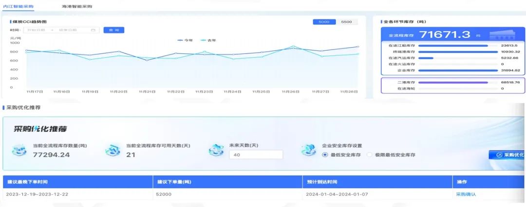 基于CCI指数,全流程库存需求,等数据,开发智能采购模型,实现精准采购下单,基于开停窑,海轮,江轮,赣江过驳,汽运,火运等需求和在途数据,煤炭供应管理业务规则,开发智能派送模型,实现按需配送,智能采购方面通过智能采购推荐 天堂影视在线,人机结合寻求最佳采购时机。