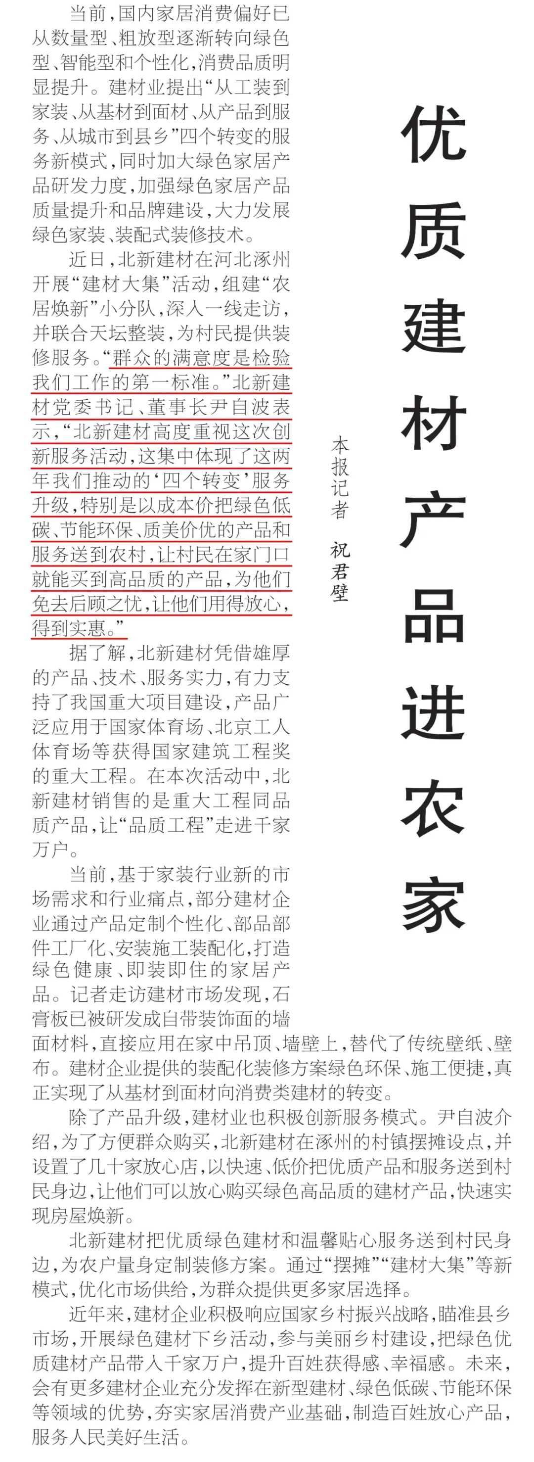 《经济日报》聚焦家居消费市场升级给建材行业带来的新变化,北新建材响应国家乡村振兴战略 免费电影,积极推进“四个转变”,创新服务模式,把重大工程同品质产品带到村民家门口,服务人民美好生活。