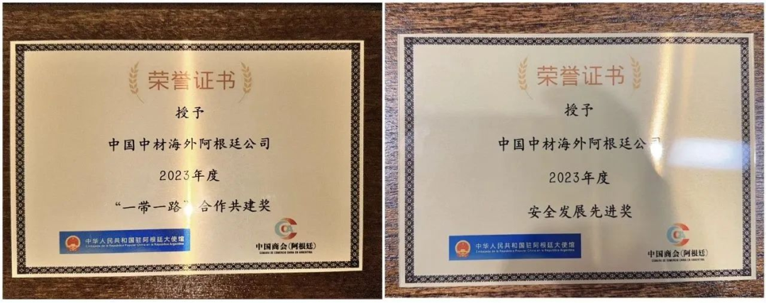 此外,在中国驻阿根廷大使馆的领导下 天堂影视在线,中国商会组织在阿的各中资企业召开了“2023年中资企业年会”,对杰出中资企业进行了表彰,中材海外阿根廷子公司荣获“2023年度安全发展先进奖”和“2023年度‘一带一路’合作共建奖”。